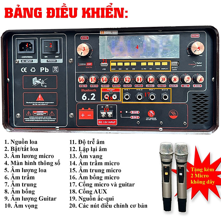 không chỉ hỗ trợ kết nối Bluetooth 6.2 tiện lợi, cho phép bạn dễ dàng kết nối với các thiết bị di động và máy tính bảng, mà còn tích hợp cổng USB, MIC, AUX giúp bạn thoải mái lựa chọn nguồn nhạc yêu thích. Ngoài ra, sản phẩm còn đi kèm với 2 micro không dây sóng UHF tiện ích, giúp bạn thể hiện tài năng ca hát một cách tự do và không bị ràng buộc.