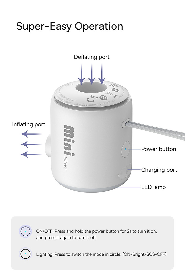 Sản phẩm này có một bộ pin sạc tích hợp, cho phép bạn sử dụng nó mà không cần cắm điện trực tiếp. Bạn chỉ cần sạc pin trước khi sử dụng và máy bơm sẽ hoạt động dễ dàng.
