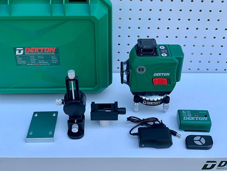 Sản phẩm nổi bật với sắc xanh đặc trưng của Dekton, đi kèm bộ phụ kiện chuyên dụng giúp tối ưu hóa hiệu quả làm việc. Máy được trang bị 2 viên pin dung lượng 3.6Ah, đảm bảo nguồn năng lượng dồi dào cho các ca làm việc kéo dài. Đặc biệt, tính năng Remote điều khiển từ xa đi kèm cho phép người dùng thay đổi chế độ tia hoặc bật/tắt máy từ vị trí thi công mà không cần di chuyển lại gần thiết bị, cực kỳ hữu ích khi làm việc trên cao hoặc trong không gian rộng. Toàn bộ máy và phụ kiện được bảo vệ trong hộp nhựa BMC chắc chắn, thuận tiện cho việc di chuyển và bảo quản.