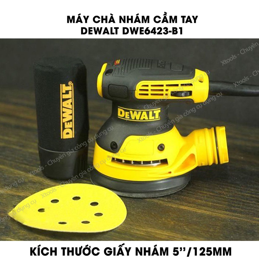 Giới thiệu Máy chà nhám cầm tay DeWALT kèm đế chà và túi chứa bụi, đa tốc độ cơ chế tự động hút bụi nhám, vỏ máy cách điện 2 lớp