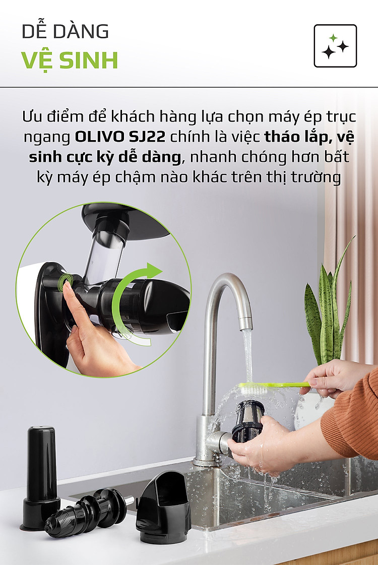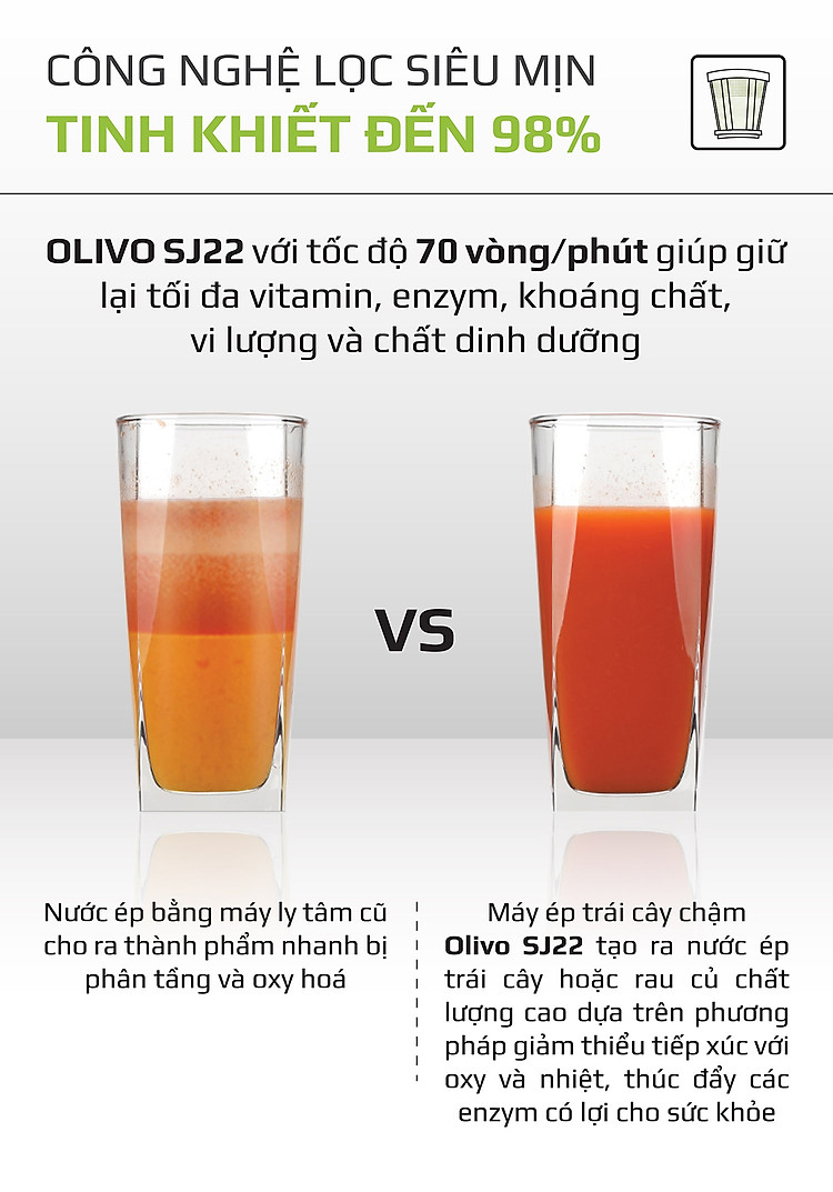 - Máy ép trái cây chậm Olivo SJ22 tạo ra nước ép trái cây hoặc rau củ chất lượng cao dựa trên phương pháp giảm thiểu tiếp xúc với oxy và nhiệt, thúc đẩy các enzym có lợi cho sức khỏe. Vì vậy, bạn có thể lưu trữ nước ép trái cây đến 72h mà không lo hề bị phân hủy hay tách nước.