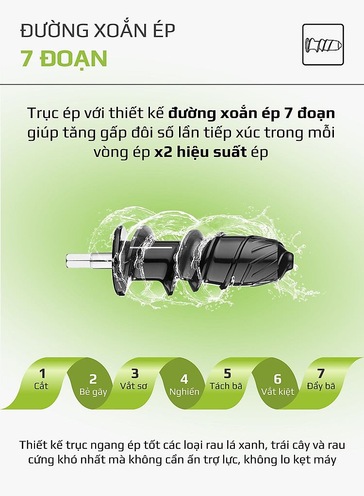 - Đặc biệt, với thiết kế đường xoắn ép 7 đoạn giúp tăng gấp đôi số lần tiếp xúc trong mỗi vòng ép. Đầu trục được thiết kế thu nhỏ dần với các gân hoa khế kết hợp với phần đầu trục vừa khít giúp thực phẩm được vắt kiệt lần cuối trước khi được đẩy ra đồng thời giúp chống kẹt máy.