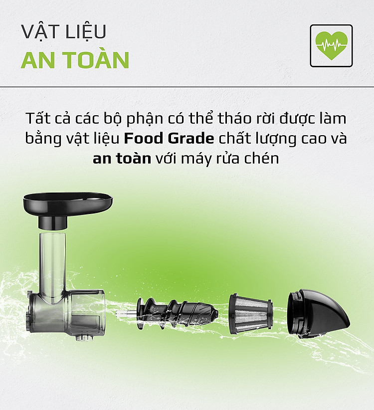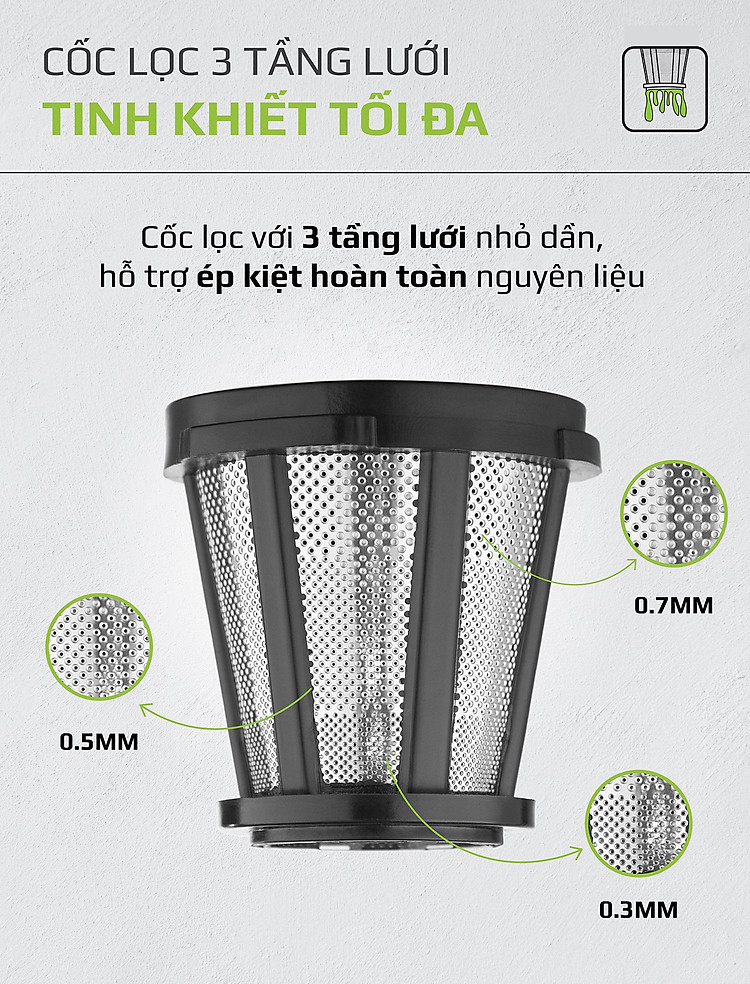 - Cốc lọc với 3 tầng lưới nhỏ dần, hỗ trợ ép kiệt hoàn toàn thực phẩm và cho ra thành phẩm có độ tinh khiết cao nhất.