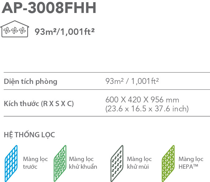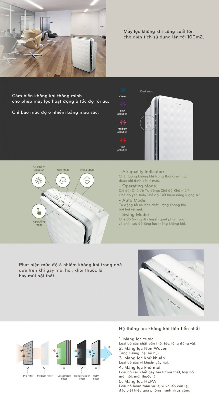 được sản xuất và lắp ráp tại nhà máy Coway ở Hàn Quốc. Sản phẩm sở hữu toàn bộ những tính năng và công nghệ cao cấp nhất của Coway hiện nay. Được trang bị hệ thống lọc 5 bước, đặc biệt có màng lọc dầu giúp loại bỏ hoàn toàn ô nhiễm từ xăng xe (chỉ duy nhất máy lọc không khí Coway AP-3008FH có màng lọc này). Ngoài ra là hệ thống lọc 2 tầng (mỗi tầng 5 màng lọc) mang đến hiệu quả làm sạch không khí tối đa.