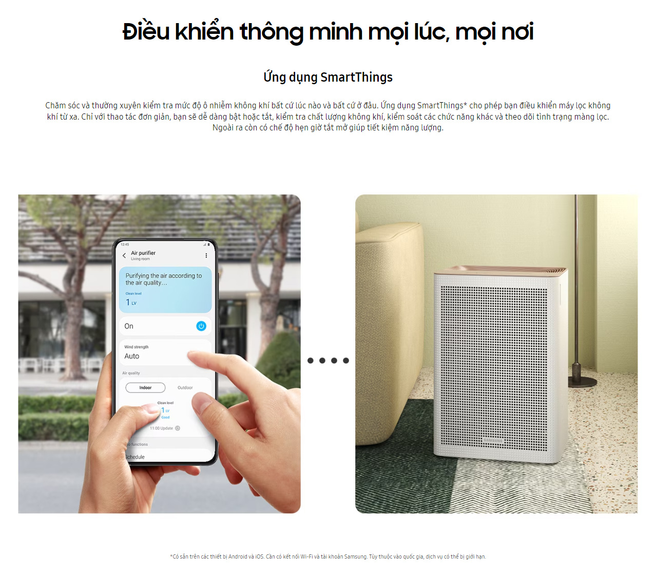 Chăm sóc và thường xuyên kiểm tra mức độ ô nhiễm không khí bất cứ lúc nào và bất cứ ở đâu. Ứng dụng SmartThings* cho phép bạn điều khiển máy lọc không khí từ xa. Chỉ với thao tác đơn giản hoặc sử dụng giọng nói**, bạn sẽ dễ dàng bật hoặc tắt, kiểm tra chất lượng không khí, kiểm soát các chức năng khác và theo dõi tình trạng màng lọc. Ngoài ra còn có chế độ hẹn giờ tắt mở giúp tiết kiệm năng lượng.