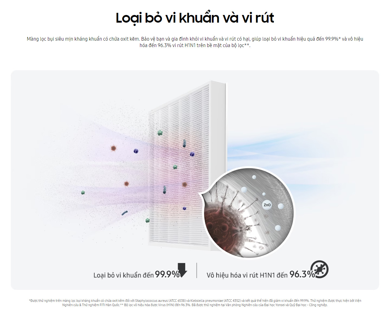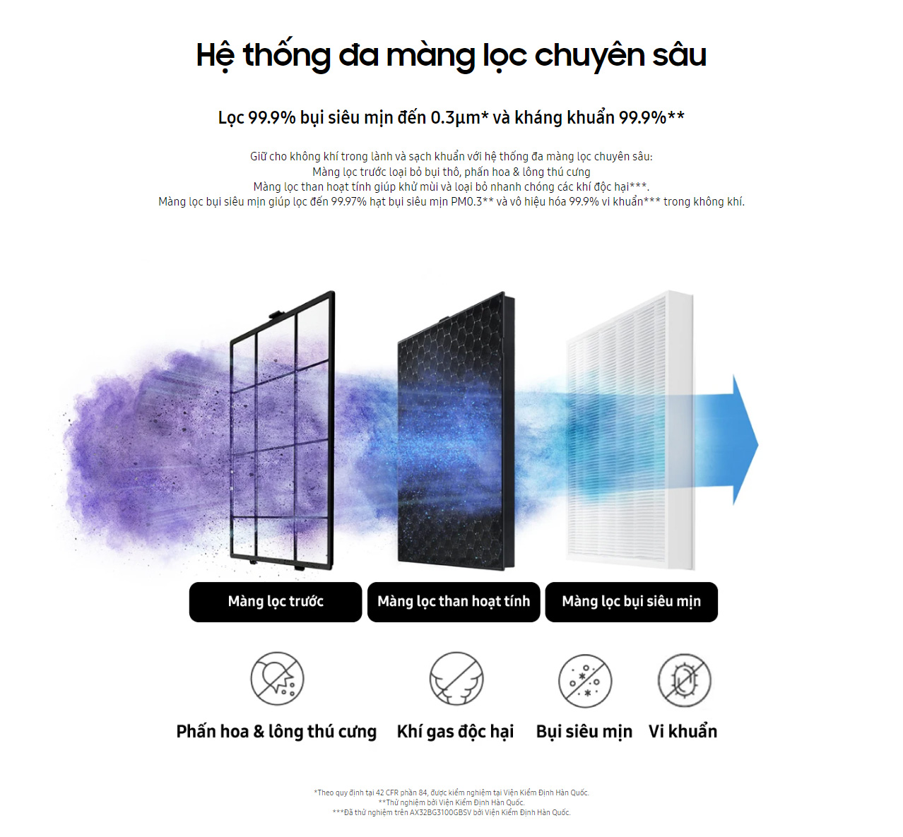 - Lọc 99.9% bụi siêu mịn 0.3μm (PM1.0) và kháng khuẩn 99.9%: Hệ thống đa màng lọc chuyên sâu