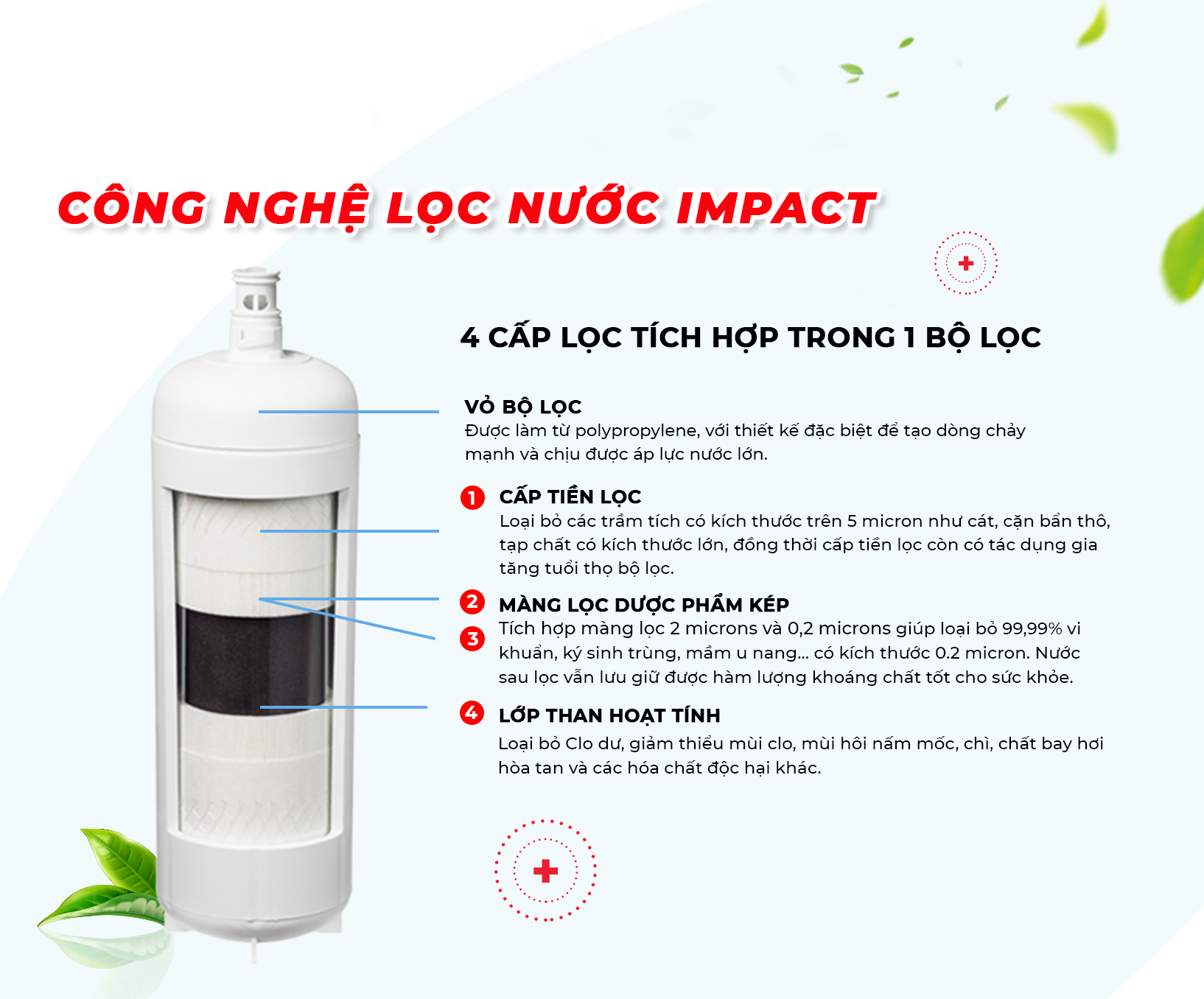 | Số lõi lọc | Tích hợp 4 cấp lọc trong cùng 1 bộ lọc giúp gia tăng lưu lượng nước, tăng tuổi thọ bộ lọc và tiết kiệm chi phí |