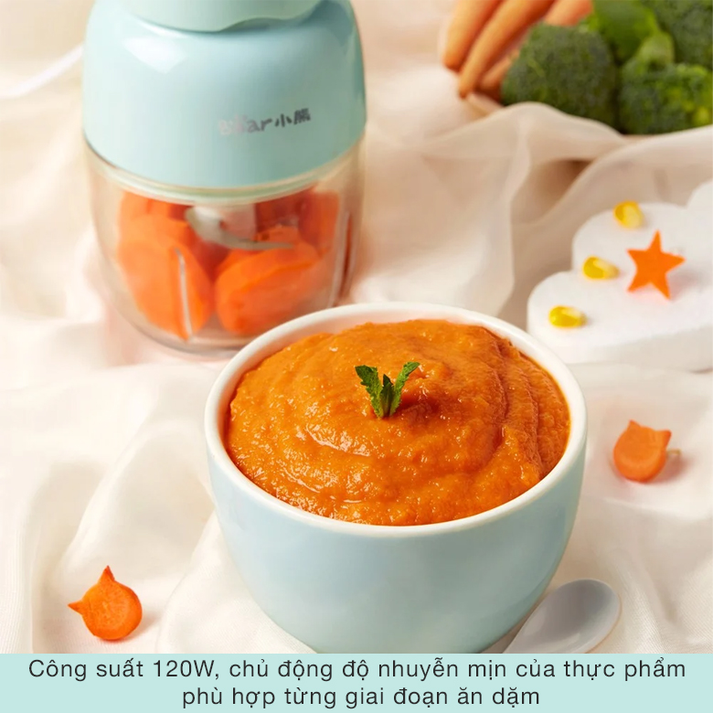 Máy xay cho bé ăn dặm Bear có thể xay nhuyễn các loại thực phẩm mềm sau khi sơ chế như: cà rốt, khoai tây, bánh quy, hành tây, rau xanh,... Để xay thịt, bạn nên cắt nhỏ thịt thành từng miếng, sau đó cho vào máy xay một lượng vừa đủ để không vượt quá giới hạn của cốc xay.