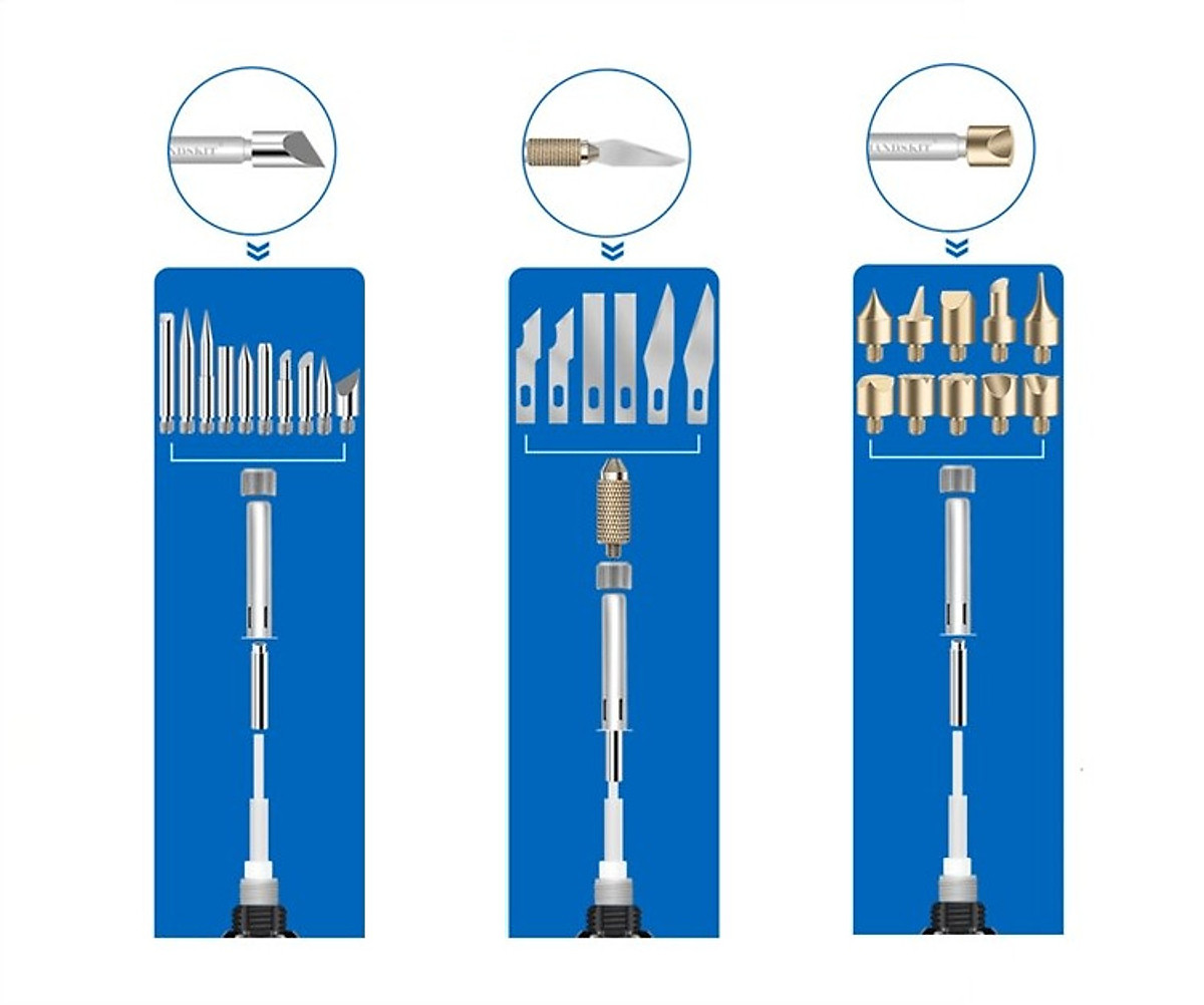 Sản phẩm sử dụng điện 220V công suất 60W cho phép việc điều chỉnh nhiệt độ trở nên dễ dàng, giúp cho bạn có thể thực hiện các mối hàn một cách đơn giản hơn. Sản phẩm này có 71 chi tiết kèm theo như: mũi nhiệt, lưỡi dao cắt gọt, bảng khuôn chữ và số, bảng khuôn mẫu vẽ hình, bút chì màu, giá đỡ, giấy than và các loại đầu hàn kích cỡ khác nhau,…