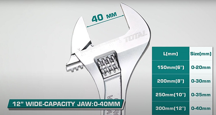 Kích thước đa dạng: Total cung cấp mỏ lết với các kích thước khác nhau bao gồm 6 inch, 8 inch, 10 inch và 12 inch. Điều này cho phép bạn lựa chọn kích thước phù hợp với nhu cầu và công việc cụ thể của mình.