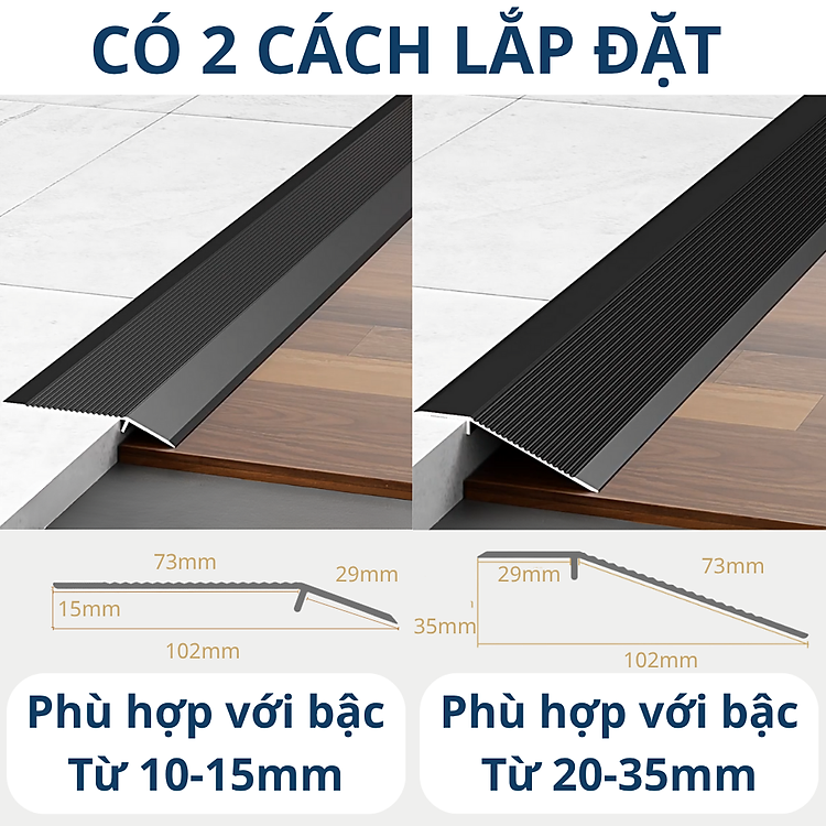 1. Phù hợp với bậc cao từ 10-15mm (Như video hướng dẫn lắp đặt)