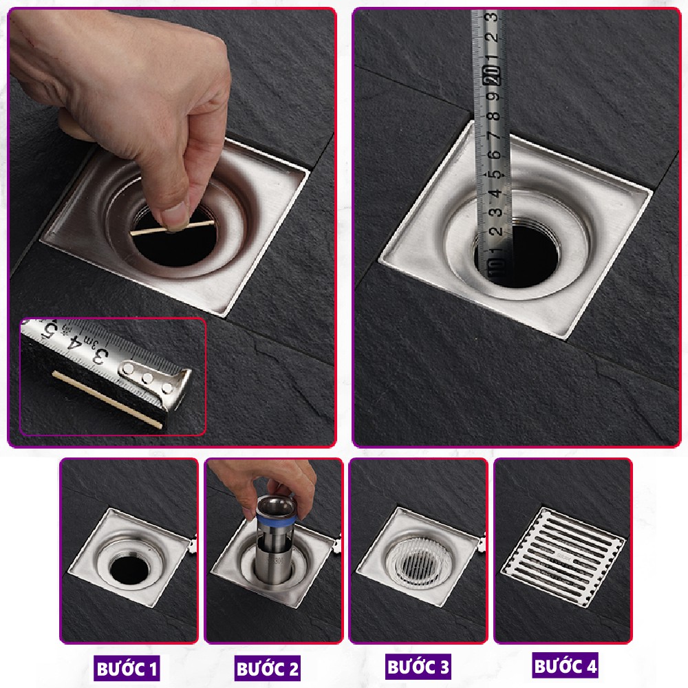 1.Đo đường kính lỗ: dùng que tăm ướm vào lỗ thoát sàn (cái lỗ để nước thoát) rồi bẻ ra, lấy thước đo que tăm vừa bẻ xem dài bao nhiêu rồi đối chiếu với kích thước đường kính Inox ngăn mùi ở trên