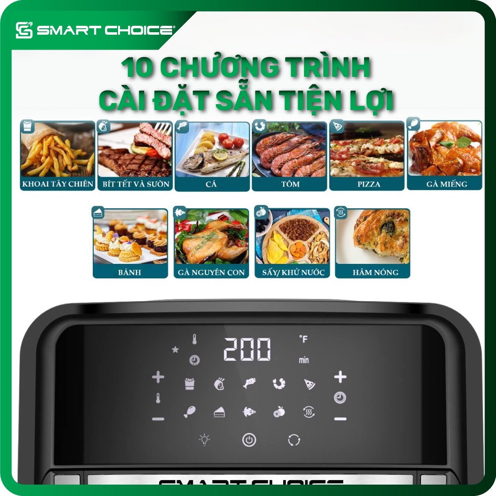 • Nồi chiên không dầu 12 lít Smartchoice đa dạng nấu nướng với 10 chế độ cài đặt sẵn. Chế biến các món nướng như thịt nướng, bánh nướng, bắp nướng, khoai chiên, hay rã đông, sấy khô thực phẩm, sấy trái cây,