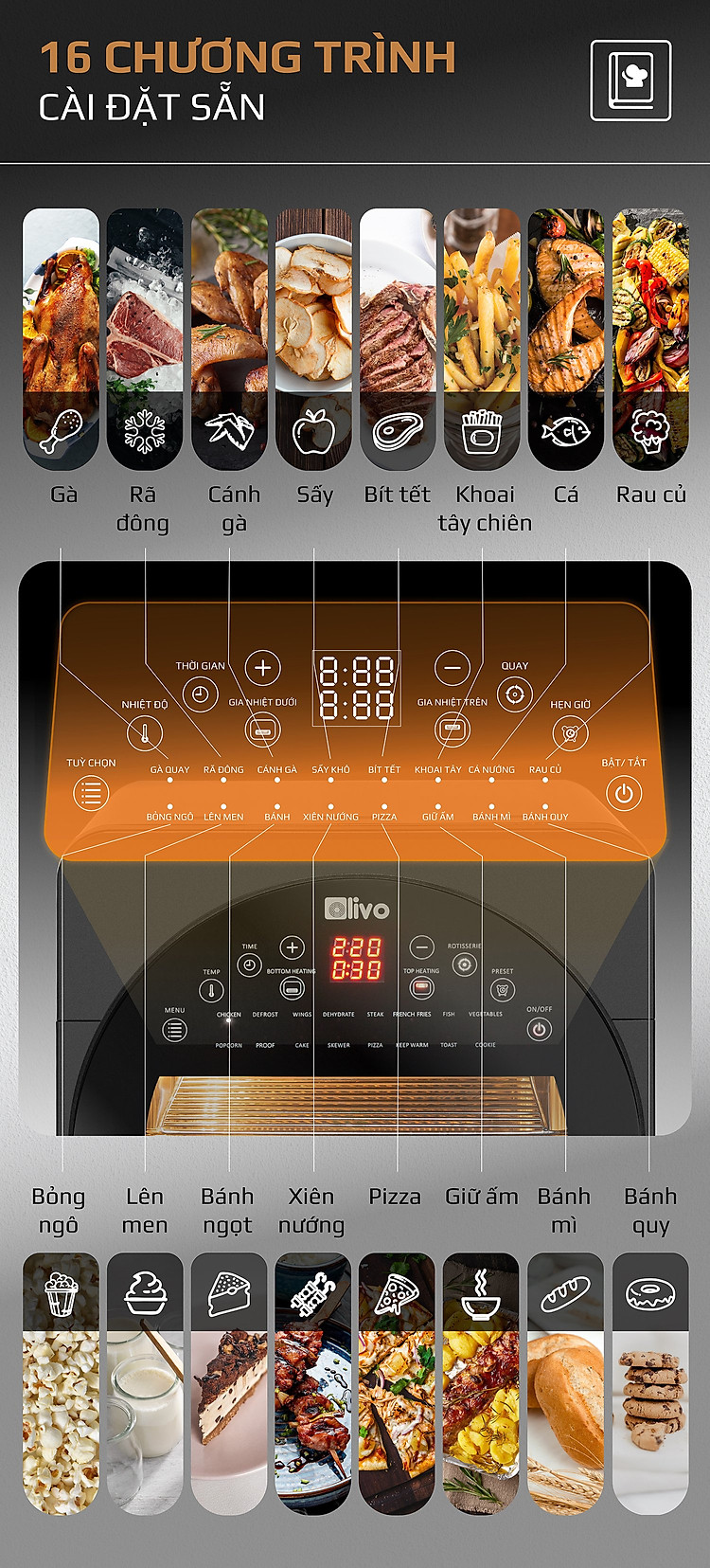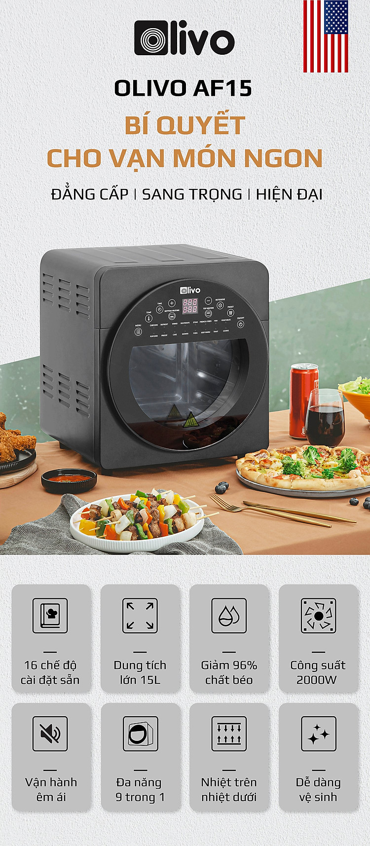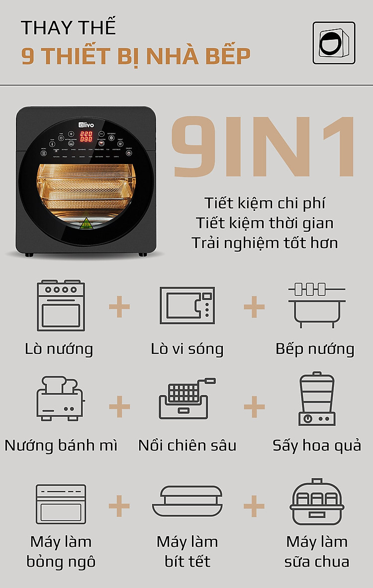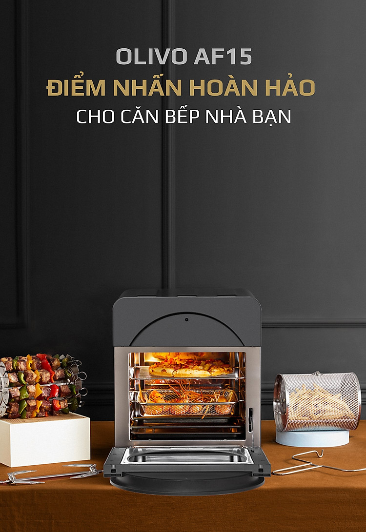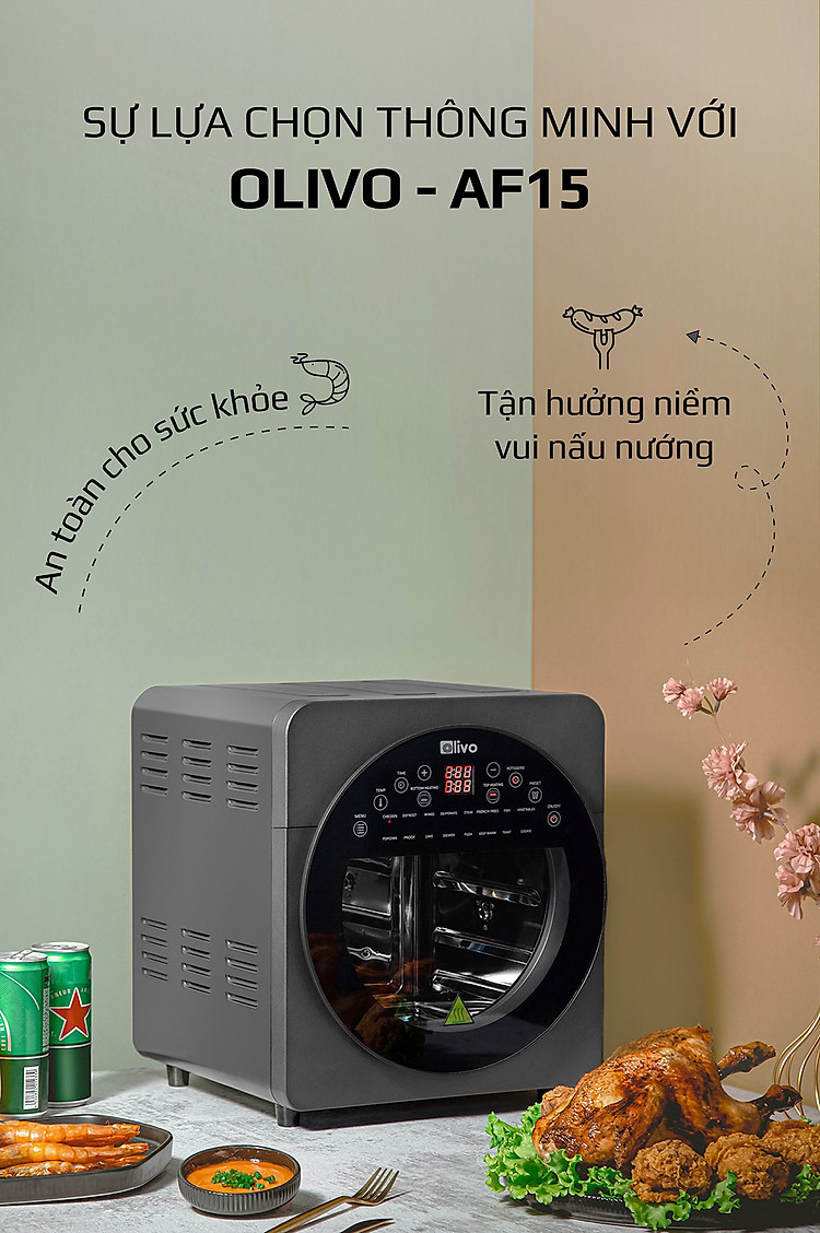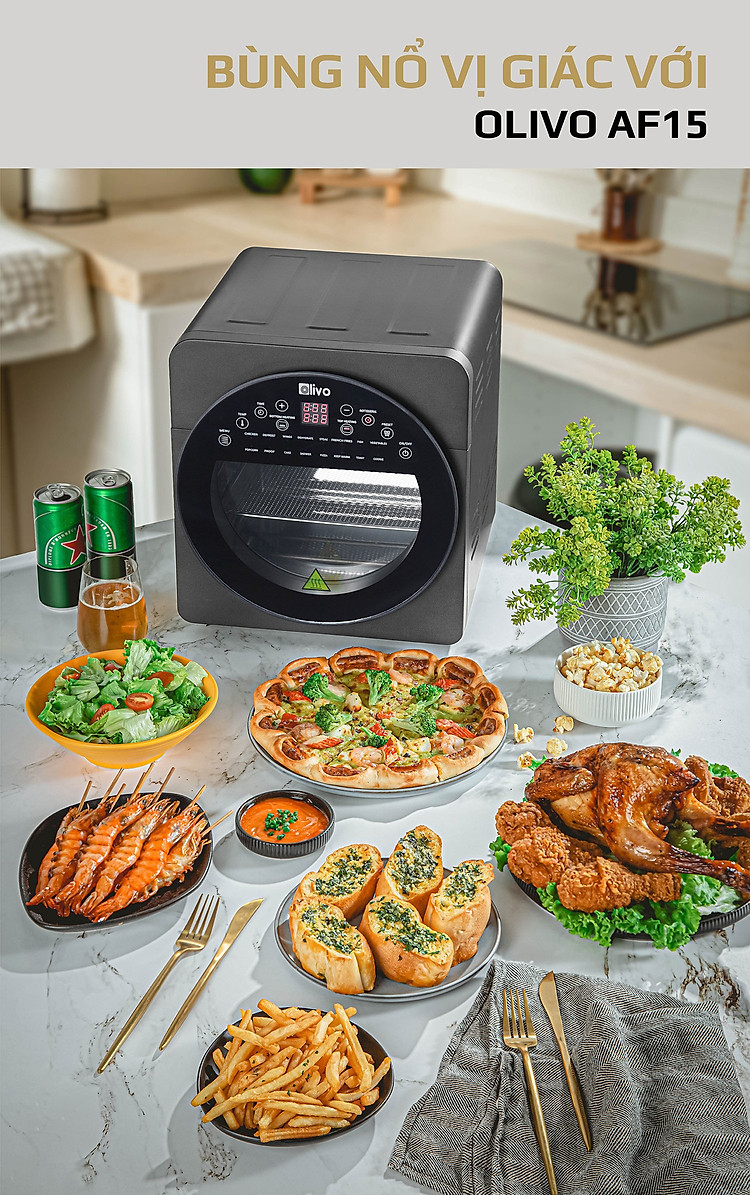 - OLIVO AF15 có thể được sử dụng thay thế các thiết bị nhà bếp khác như lò nướng, lò vi sóng, bếp nướng, máy sấy hoa quả, máy nướng bánh mì, máy làm bỏng ngô và máy làm sữa chua, nồi chiên sâu, máy làm bít tết.