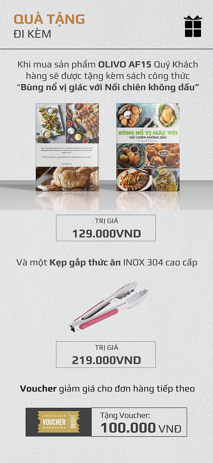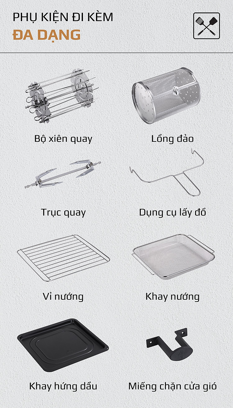 - Bộ phụ kiện này kết hợp với những tính năng và công nghệ tiên tiến ưu việt có trên OLIVO AF15 giúp bạn có thể làm vạn món ngon, đổi món liên tục mà không bị ngấy và nhàm chán.