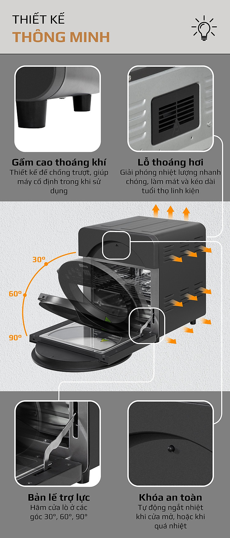 - Do sự kết hợp giữa động cơ công suất lớn cùng với quạt mô tơ cao cấp giúp cho quá trình làm chín thức ăn diễn ra êm ái, không gây tiếng ồn khó chịu, giúp cho khi chế biến món ăn yên tĩnh không ảnh hưởng đến các hoạt động xung quanh.