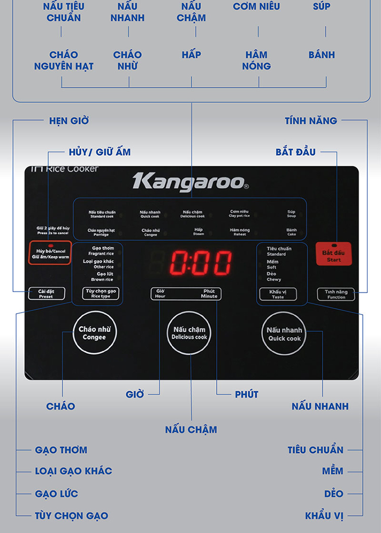 Đặc biệt, nồi được trang bị bảng điều khiển điện tử hướng dẫn tiếng Việt, màn hình hiển thị rõ ràng giúp bạn tùy chỉnh các chức năng, chế độ nấu linh hoạt, chính xác. Bên cạnh đó, còn có các chế độ nấu tự động đa dạng gồm nấu cơm tiêu chuẩn, nấu chậm, nấu nhanh, cơm niêu, nấu súp, nấu cháo nguyên hạt, cháo nhừ, làm bánh, hấp.