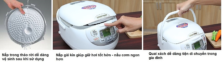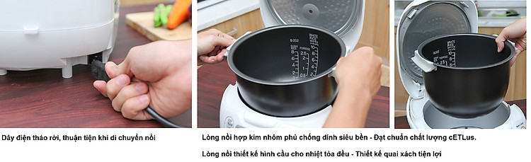 - Lòng nồi hợp kim được phủ lớp chống dính bền chắc, giúp cơm nấu chín thơm ngon hơn, không bị bám dính vào nồi, dễ dàng chùi rửa.