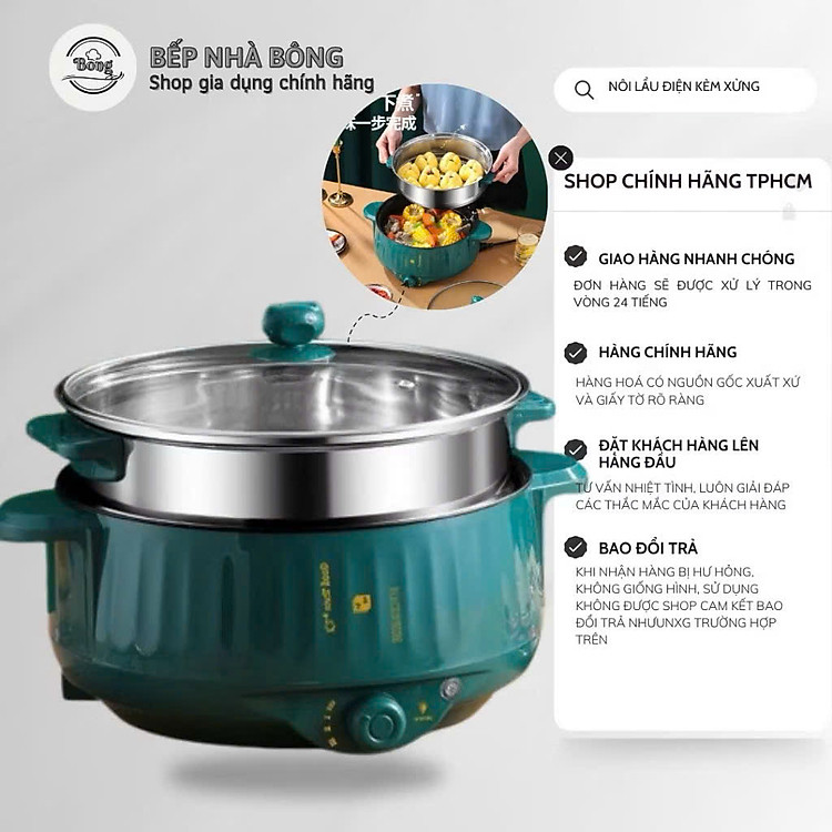 - Thiết kế 2 tầng đa năng: Tầng dưới nấu lẩu, canh, xào; tầng trên hấp bánh, hấp hải sản, hấp rau củ…