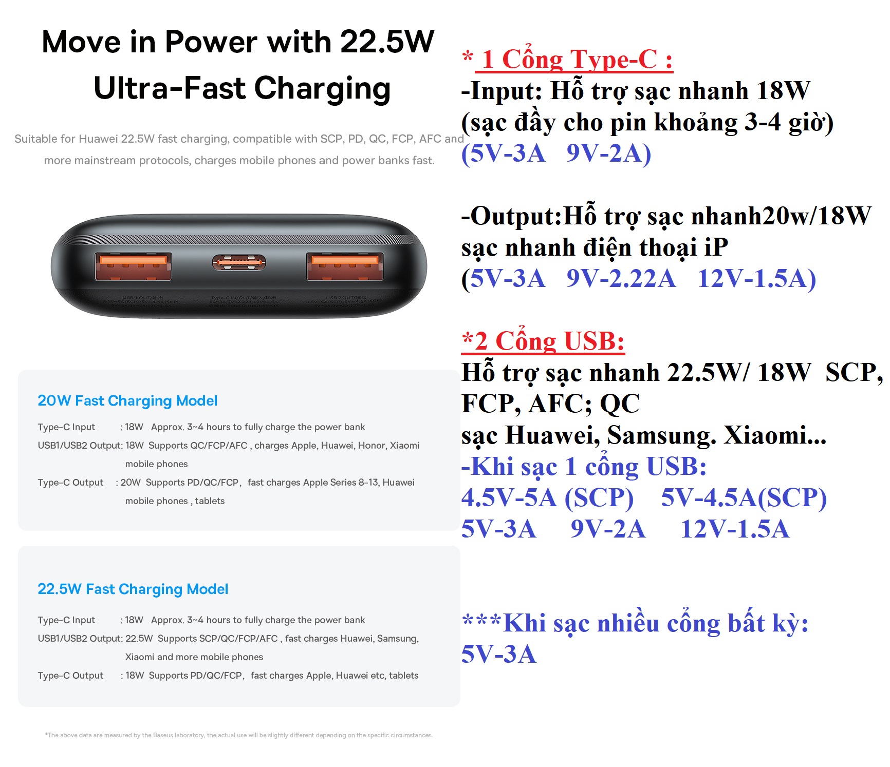 ● Khi sạc 1 cổng USB: 4.5V-5A (SCP) 5V-4.5A(SCP) 5V-3A 9V-2A 12V-1.5A