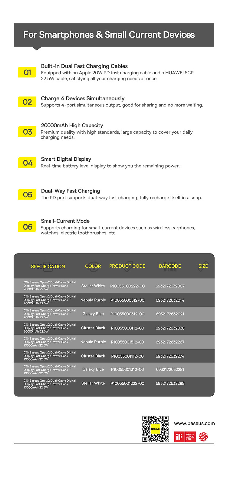 Với công suất 22.5W, Pin Sạc Dự Phòng OS-Baseus Qpow2 Dual-Cable Digital Display Fast Charge Power Bank đảm bảo sẽ cung cấp đủ năng lượng cho thiết bị di động của bạn khi cần thiết.