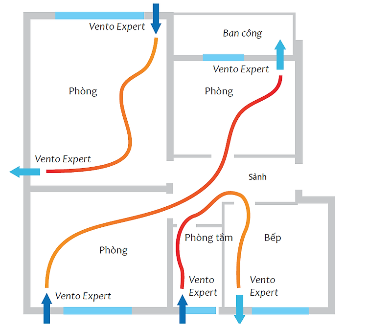 - Giải pháp thông gió tốt nhất là lắp đặt theo cặp các thiết bị đồng bộ ngược pha. Một số thiết vị đảm bảo cung cấp không khí trong lành cho phòng và các thiết bị khác lấy không khí từ phòng. Bằng cách này, hệ thống thông gió cân bằng hiệu quả nhất