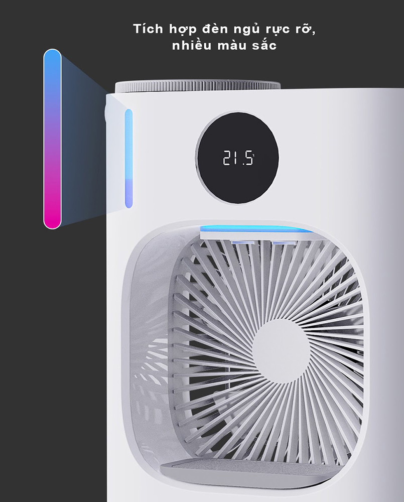 Ngoài ra, sản phẩm còn được tích hợp dải đèn nhỏ ở cạnh, vào ban đêm ánh sáng từ đây sẽ giúp người dùng có thể nhận diện vị trí của quạt. Đồng thời đây cũng là vạch chỉ báo mực nước của bình chứa nước, cho phép người dùng có thể dễ dàng quan sát và theo dõi lượng nước còn lại trong bình, từ đó chủ động thêm nước khi nước gần cạn hết.