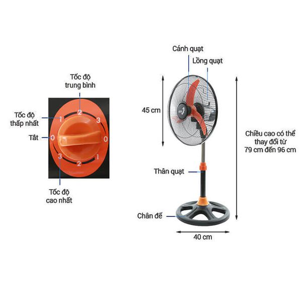 - Quạt với 3 cánh quạt đường kính 40 cm, hoạt động dưới công suất 45 W tạo luồng gió nhanh và mạnh làm mát hiệu quả trên không gian rộng.