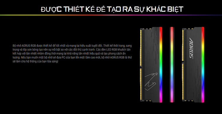 Bộ nhớ AORUS RGB mới được thiết kế để mang lại hiệu suất tuyệt đối. Thiết kế thời trang, sang trọng và lớp sơn bóng tạo nên sự nổi bật so với các đối thủ. Các đèn LED RGB khuếch tán kết hợp với tản nhiệt nhôm đồng thời mang đến khả năng tản nhiệt hiệu quả và tạo phong cách ấn tượng. Nếu bạn muốn nâng tầm PC của bạn lên một tầm cao mới, Bộ nhớ AORUS RGB là thứ sẽ làm cho hệ thống của bạn tỏa sáng!