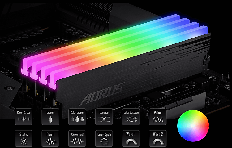 Bộ nhớ AORUS RGB hỗ trợ 12 chế độ chiếu sáng. 5 chế độ chiếu sáng mới chỉ dành cho Bộ nhớ AORUS RGB. Color strobe, Cascade, Color Cascade, Droplet và Color Droplet là những chế độ mới bổ sung phong cách độc đáo cho hệ thống của bạn.