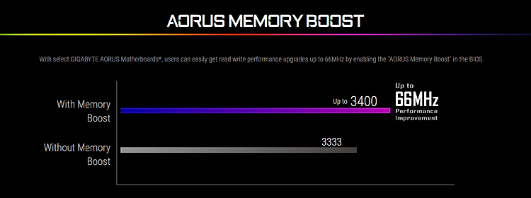 Với một số Bo mạch chủ GIGABYTE AORUS *, người dùng có thể dễ dàng nâng cấp hiệu suất đọc ghi lên đến 4% bằng cách bật "AORUS Memory Boost" trong BIOS.