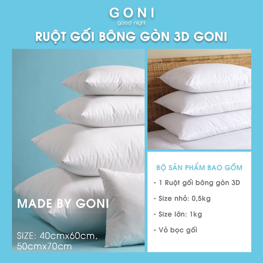 Ruột gối hơi bông gòn Goni cao cấp là một sản phẩm chắc chắn không thể thiếu của mọi gia đình Việt. Với chất liệu vải thoảng mát và ruột bông gòn 3D sẽ đem lại cho bạn một các giác siêu êm ái, mềm mại dễ dàng đi vào giấc ngủ ngon.