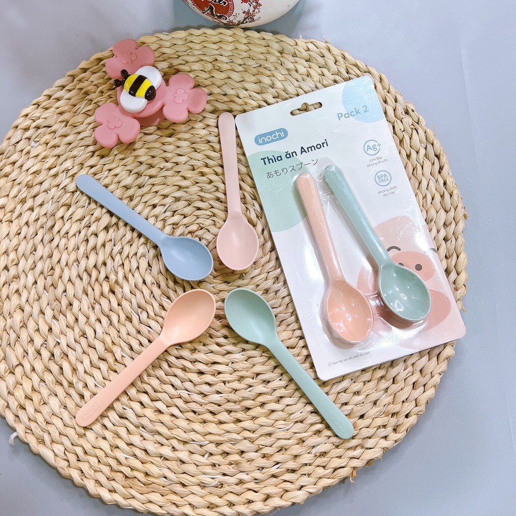 Bộ 02 thìa ăn cho bé Amori Inochi muỗng ăn dặm nhựa cao cấp thìa tập ăn trẻ em không chứa BPA kháng khuẩn Ag+