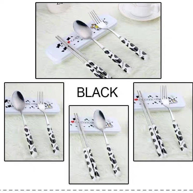 Bộ dụng cụ ăn cá nhân thìa đũa dĩa bằng inox, cán sứ có hộp đựng xin xắn tiện dụng họa tiết bò sữa