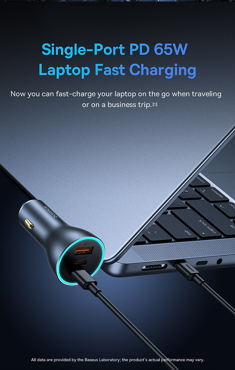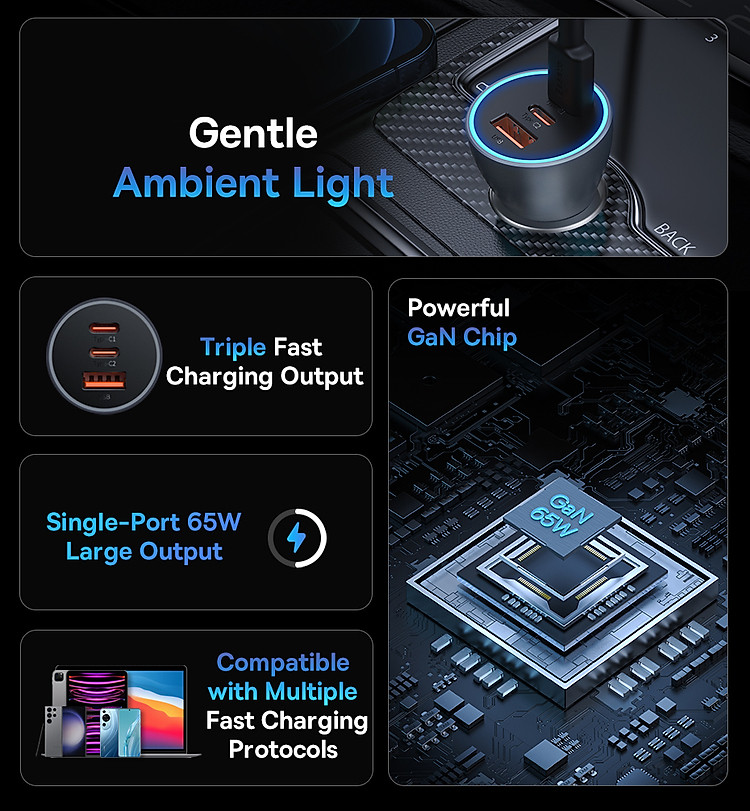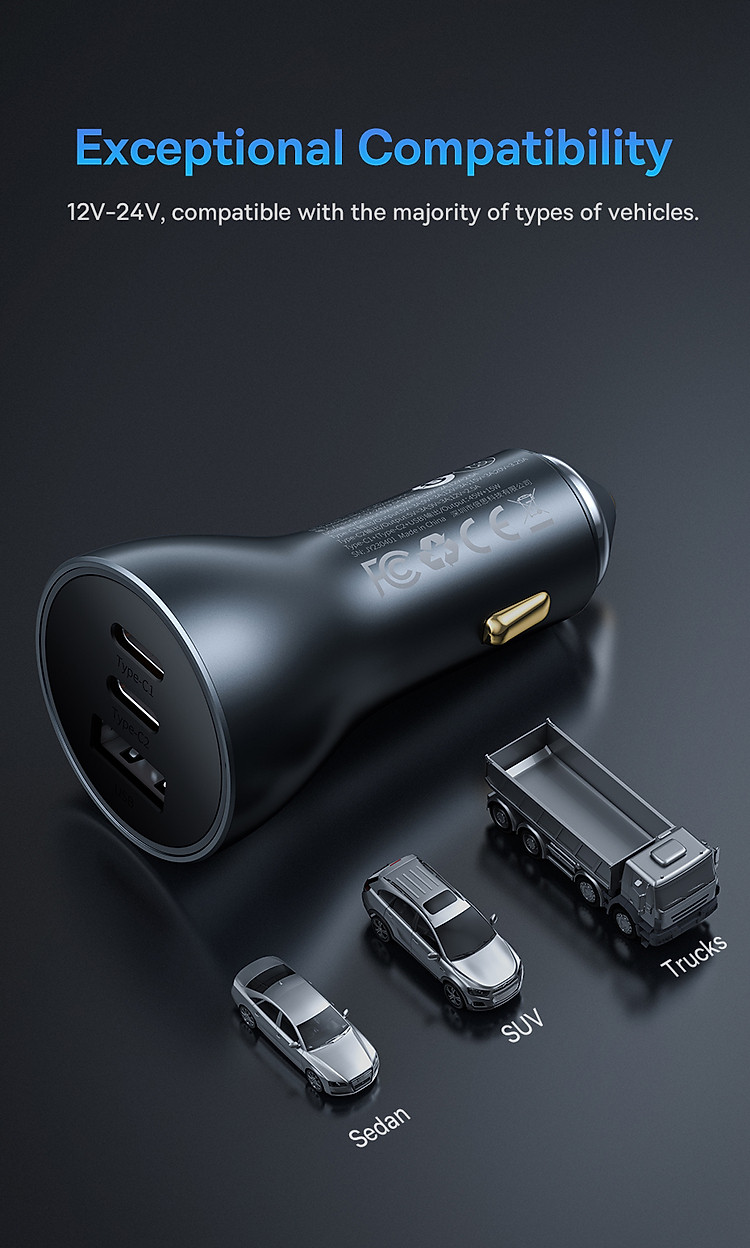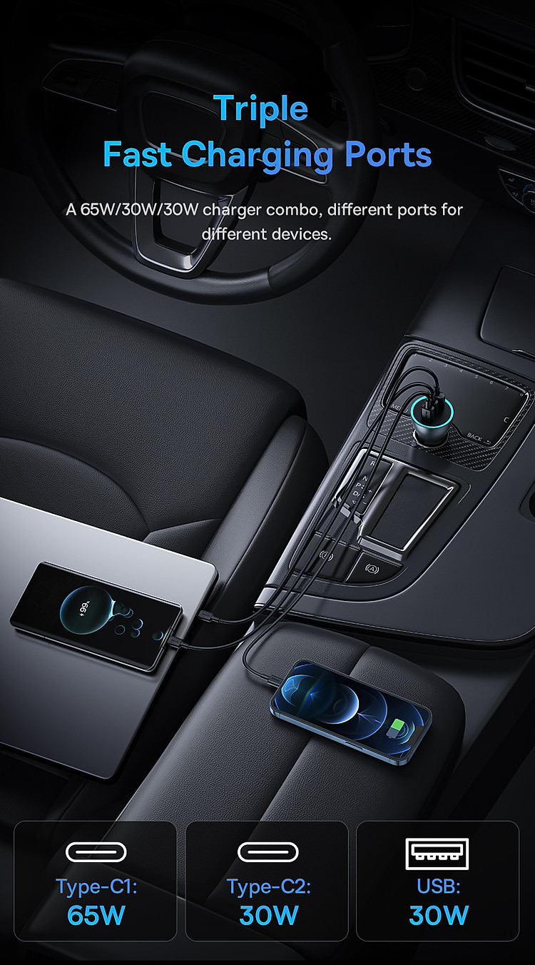 Với công suất sạc lên đến 65W, tẩu sạc này cung cấp khả năng sạc nhanh cho các thiết bị như điện thoại di động, máy tính bảng, laptop và các thiết bị khác hỗ trợ công nghệ sạc nhanh. Bạn có thể sạc nhanh và sạc đồng thời hai thiết bị một cách thuận tiện.
