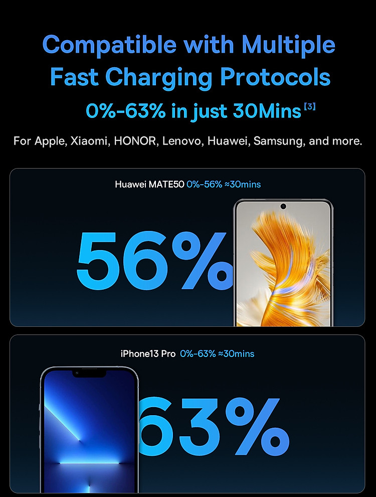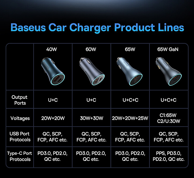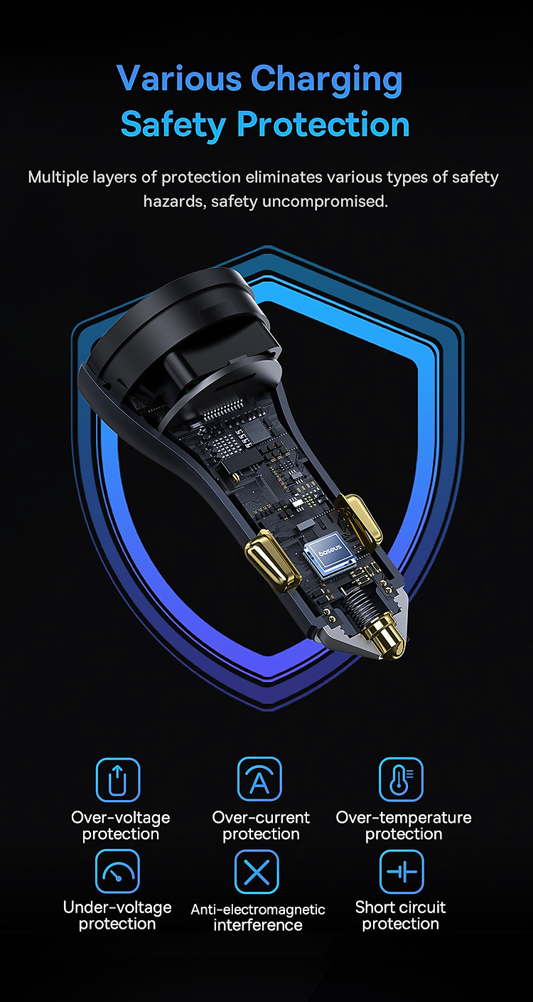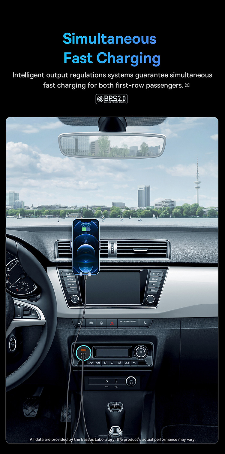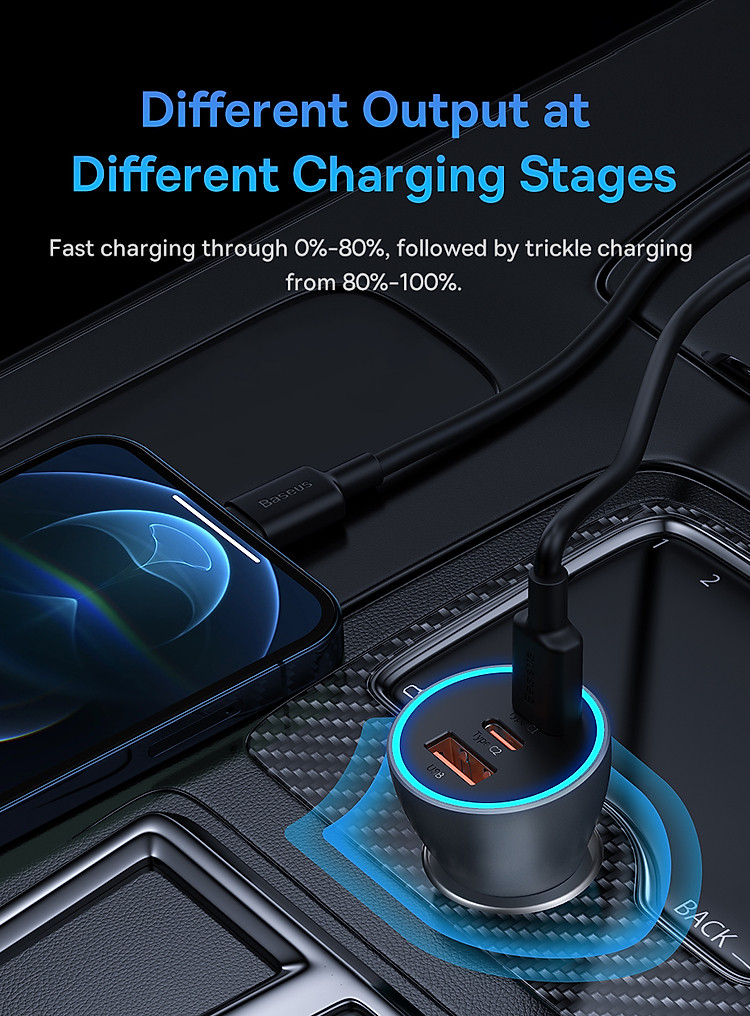 Với công suất sạc lên đến 65W, tẩu sạc này cung cấp khả năng sạc nhanh cho các thiết bị như điện thoại di động, máy tính bảng, laptop và các thiết bị khác hỗ trợ công nghệ sạc nhanh. Bạn có thể sạc nhanh và sạc đồng thời hai thiết bị một cách thuận tiện.
