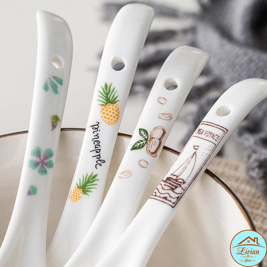 Giới thiệu Thìa canh, muỗng canh sứ trắng tay cầm nhiều họa tiết cực xinh
