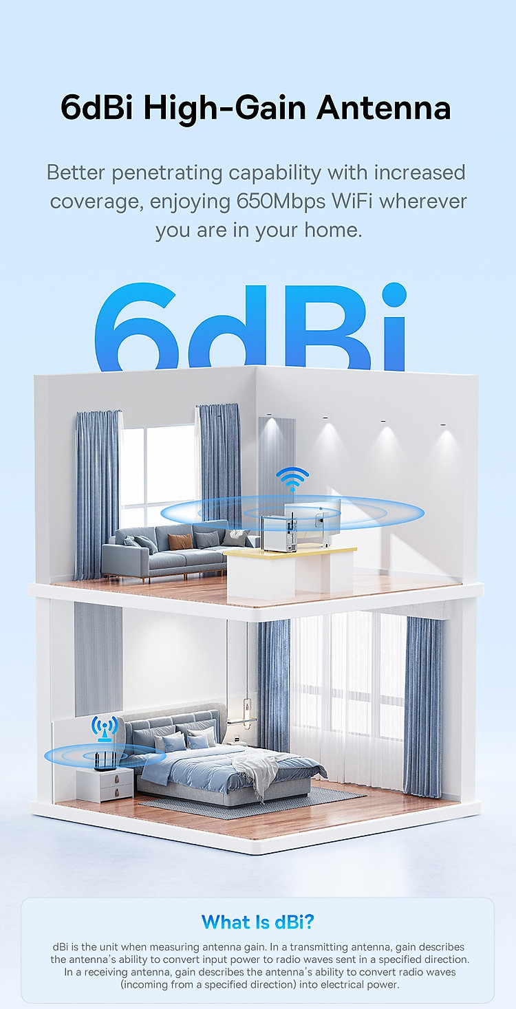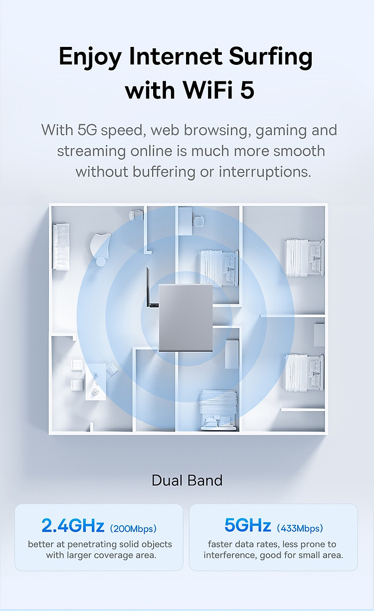 | Tốc độ truyền dữ liệu | 2.4GHz: 200Mbps 5GHz: 433Mbps |
