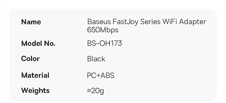 | Tên | Thiết bị nhận tín hiệu Wifi Baseus FastJoy Series WiFi Adapter |