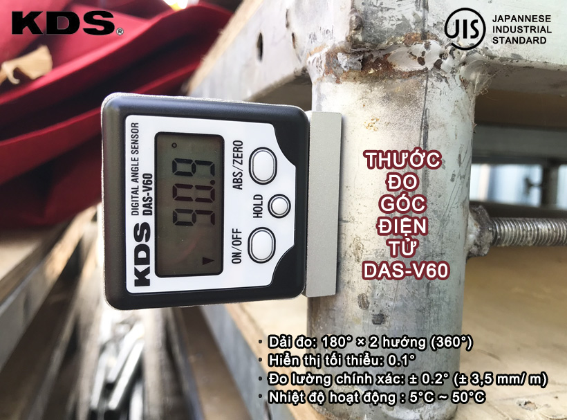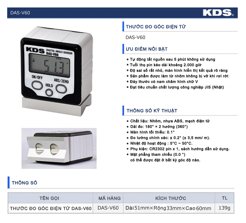 - Thước đo góc điện tử DAS-V60 KDS được hãng nổi tiếng KDS sản xuất, đạt tiêu chuẩn chất lượng công nghiệp JIS (Nhật).