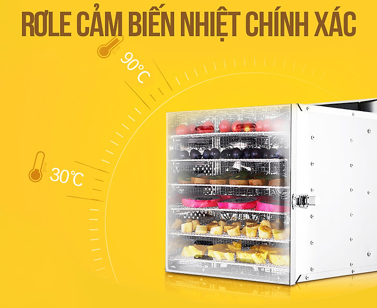 Đặc biệt, nhiệt độ luôn được duy trì mức ổn định trong khoang sấy thông qua hệ thống cảm biến nhiệt độ. Máy sẽ tự động ngắt nếu nhiệt độ đạt đến mức giới hạn cài đặt. Bạn sẽ không còn lo lắng nhiệt độ quá cao làm cháy hỏng sản phẩm nữa, đồng thời tiết kiệm thời gian sấy cho bạn.