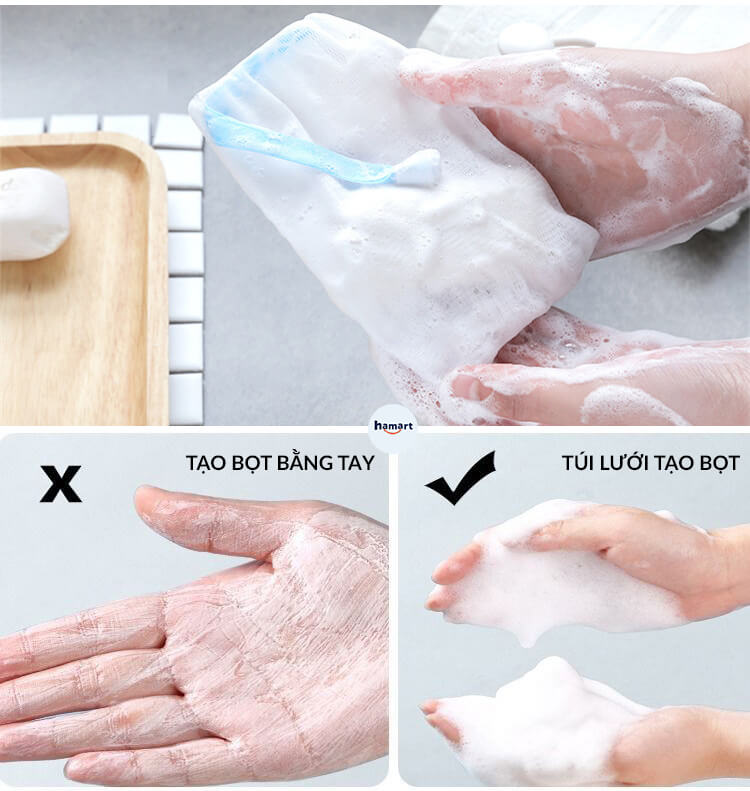 Sử dụng túi lưới giúp bạn dễ dàng taọ bọt vượt trội hơn so với dùng tay, bạn cũng có thể treo nó lên tường nhờ thiết kế dây rút tiện lợi, nhờ đó giữ xà phòng luôn khô ráo, tránh hiện tượng bánh xà bông bị mềm nhũn, bị dính chất bẩn - Vô cùng gọn gàng & sạch sẽ.