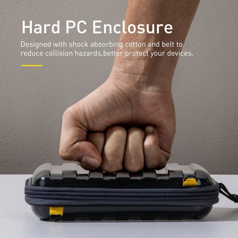 - Baseus Let’s Go Hermit Shockproof Storage Bag được thiết kế cực kì thời trang, hoàn thiện cao cấp, mọi chi tiết đều được gia công tỉ mỉ. Được làm từ nhựa Poly Carbonate cứng cáp, chống shock rất tốt