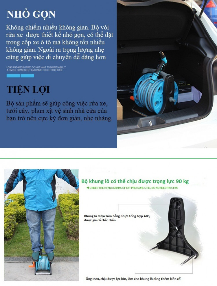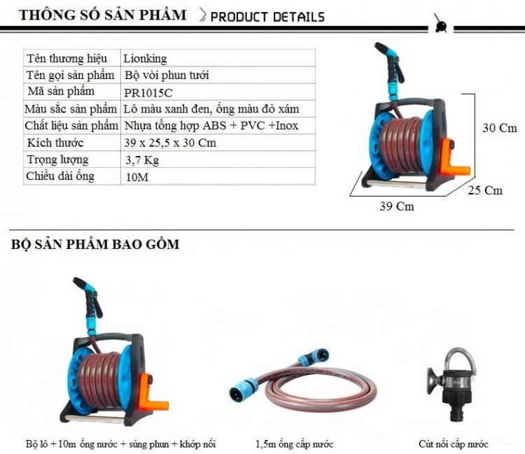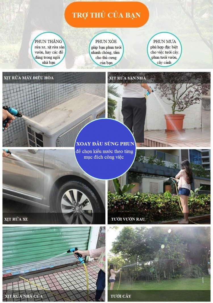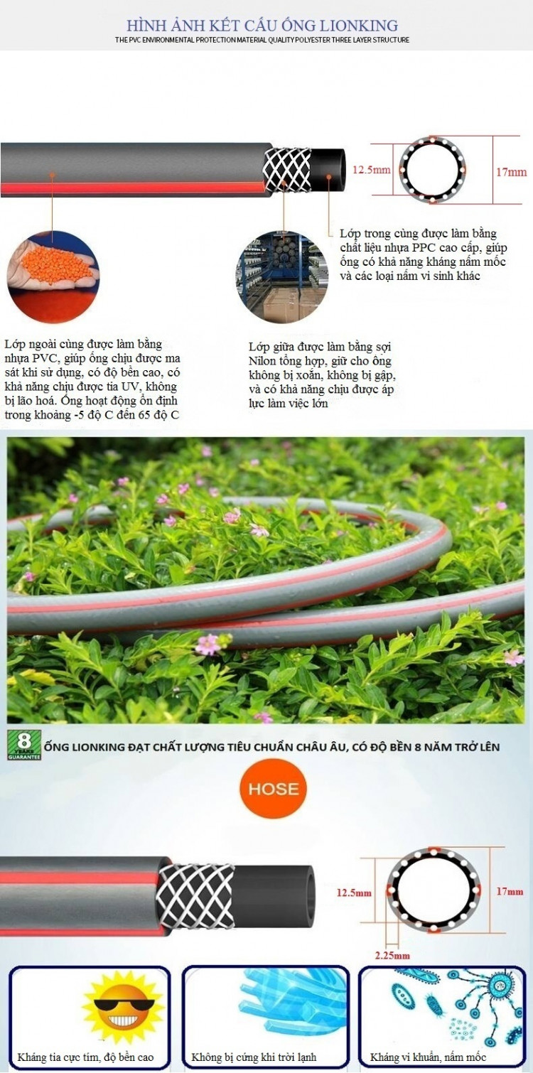 Việc rửa xe, tưới cây, phun xịt vệ sinh nhà cửa của bạn sẽ trở nên cực kỳ đơn giản, nhẹ nhàng. Ống nước Lionking GS125 có kết cấu 3 lớp, không bị gập, không bị xoắn trong quá trình sử dụng. Vòi xịt nước được làm bằng chất liệu nhựa tổng hợp có độ bền cao, thiết kế tinh xảo, sử dụng dễ dàng, có thể điều chỉnh nhiều kiểu phun nước khác nhau.